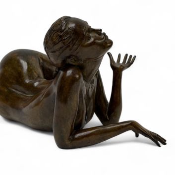 Le visage tourné vers l’intérieur suggère un la rêverie ou la refléxion silencieuse. L’œuvre est réalisée selon la technique de la cire perdue, offrant ainsi finesse et précision des détails. La texture est lisse et satinée, propre au bronze poli, accentuant les lignes pures et les volumes épurés.