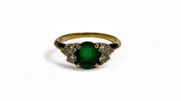 Bague en or jaune (750) ornée d’une émeraude ovale flanquée de trio de diamants Poinçon d'orfèvre Tour de doigt : 51 Poids brut : 3,2 grammes