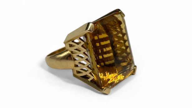 Bague en or jaune (750) ornée d'une importante citrine (27 x 24 x 17 mm env.) Poinçons d'orfèvre et tête d'aigle Tour de doigt : 55 Poids brut : 34,3 grammes